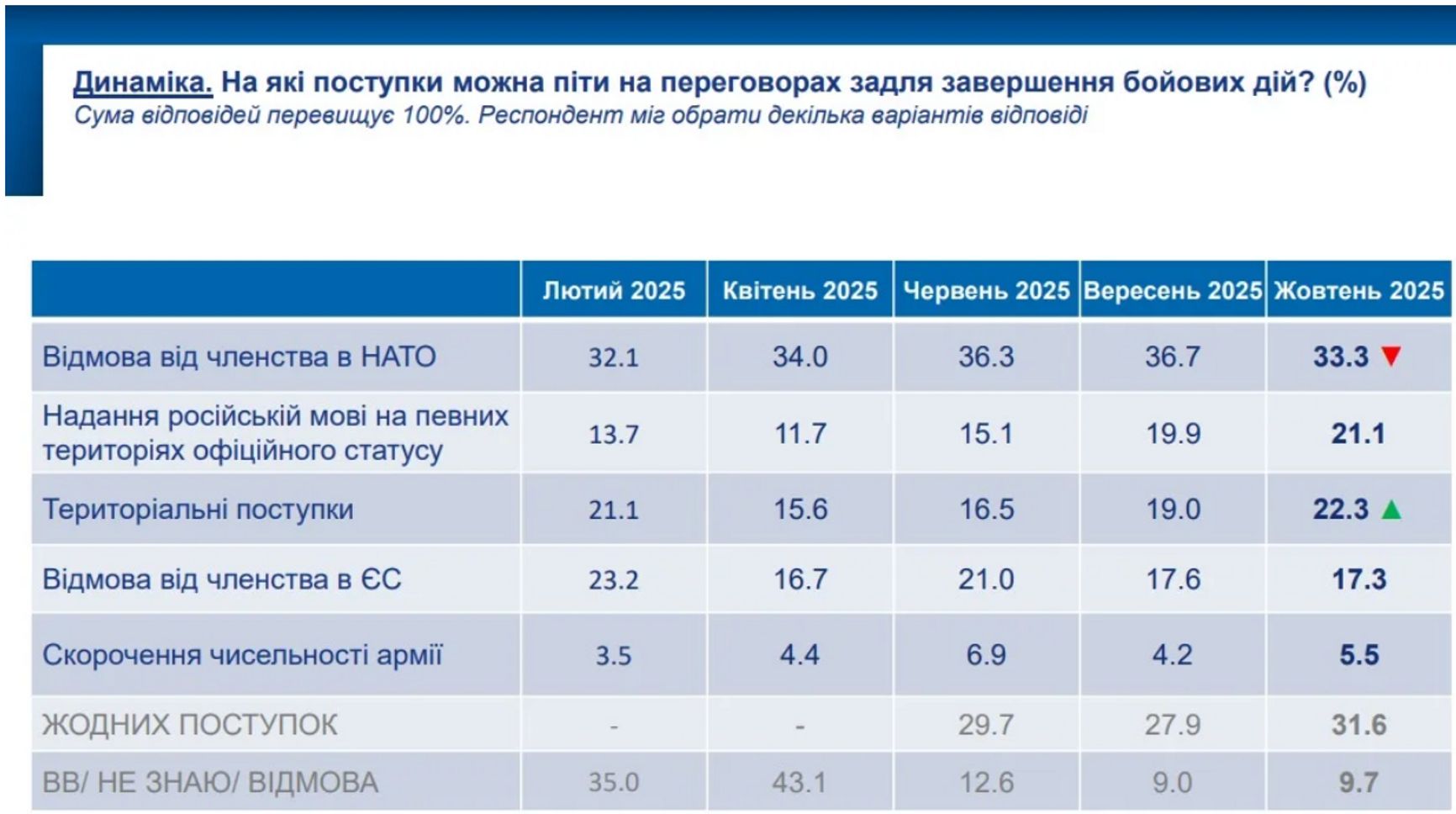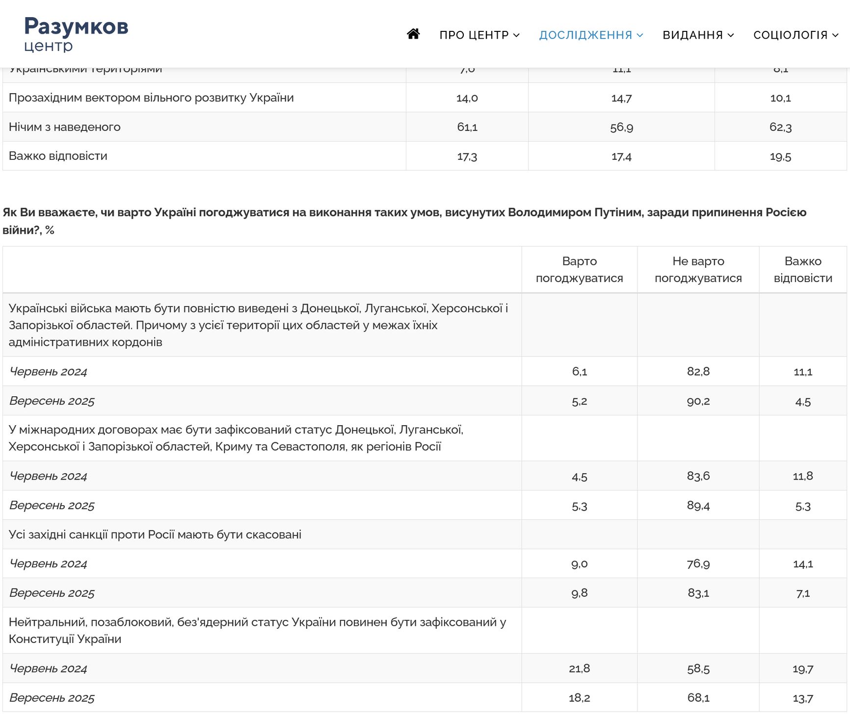 11 декабря Центр Разумкова опубликовал результаты исследования «Отношение граждан Украины к условиям, на которых должно осуществляться мирное урегулирование, и видение ими гарантий безопасности». Опрос был проведен 12–17 сентября. Вопрос сформулирован так: «Если бы это зависело от вас, чем бы вы были готовы поступиться во время переговоров с Россией»? Предложенные варианты ответа: