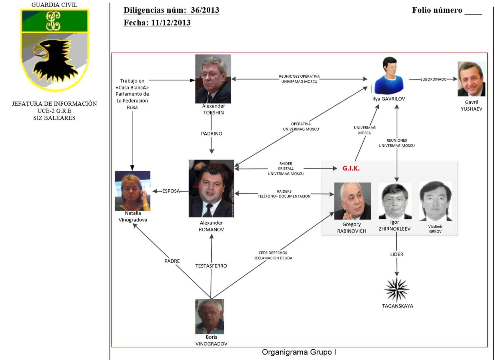 On February 21, 2013, Romanov tells Torshin that he will try to send a note through him with banking details for future transfers. Romanov also says he will not rest until he solves their common problems. The Spanish investigators presume that the transfers in question are the money obtained by takeover of the Moskva department store by the Afganets company. Its beneficiaries were Romanov (who wired his 1.6 million euros to Spain) and two more Taganskaya gang leaders, Grigory Rabinovich and Igor Zhirnokleyev.
