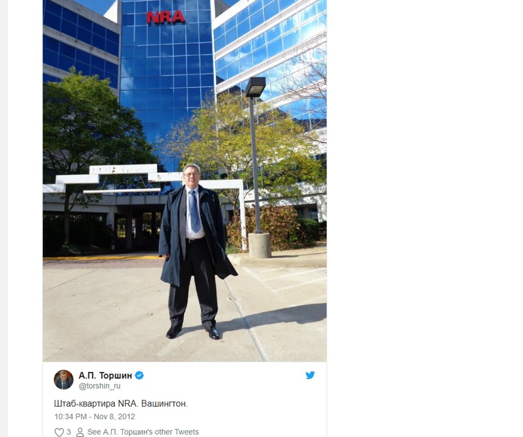 In the latest U. S. presidential campaign, the NRA (National Rifle Association) set a new record for «dark money» fundraising (i. e. money of unclear origins), procuring a total of $33 million donated by «independent contributors,» which is three times the amount the NRA spent to support Mitt Romney during the previous campaign. It was the NRA that Torshin and Butina chose as the entry point to Trump's campaign team. The pair's infiltration of the NRA itself is a captivating story. Here is how it happened. In 2011, Attorney G. Kline Preston introduced Torshin to David Keene, the then head of the NRA. Later that year, Preston came as an observer to the Russian parliamentary election and concluded it was absolutely fair. By contrast, when Torshin was observing the American election in 2012, he «detected a number of violations,» pointing out that campaigning had been taking place too close to polling stations. It was then that he rendered a visit to the NRA's headquarters in Washington, D. C.: