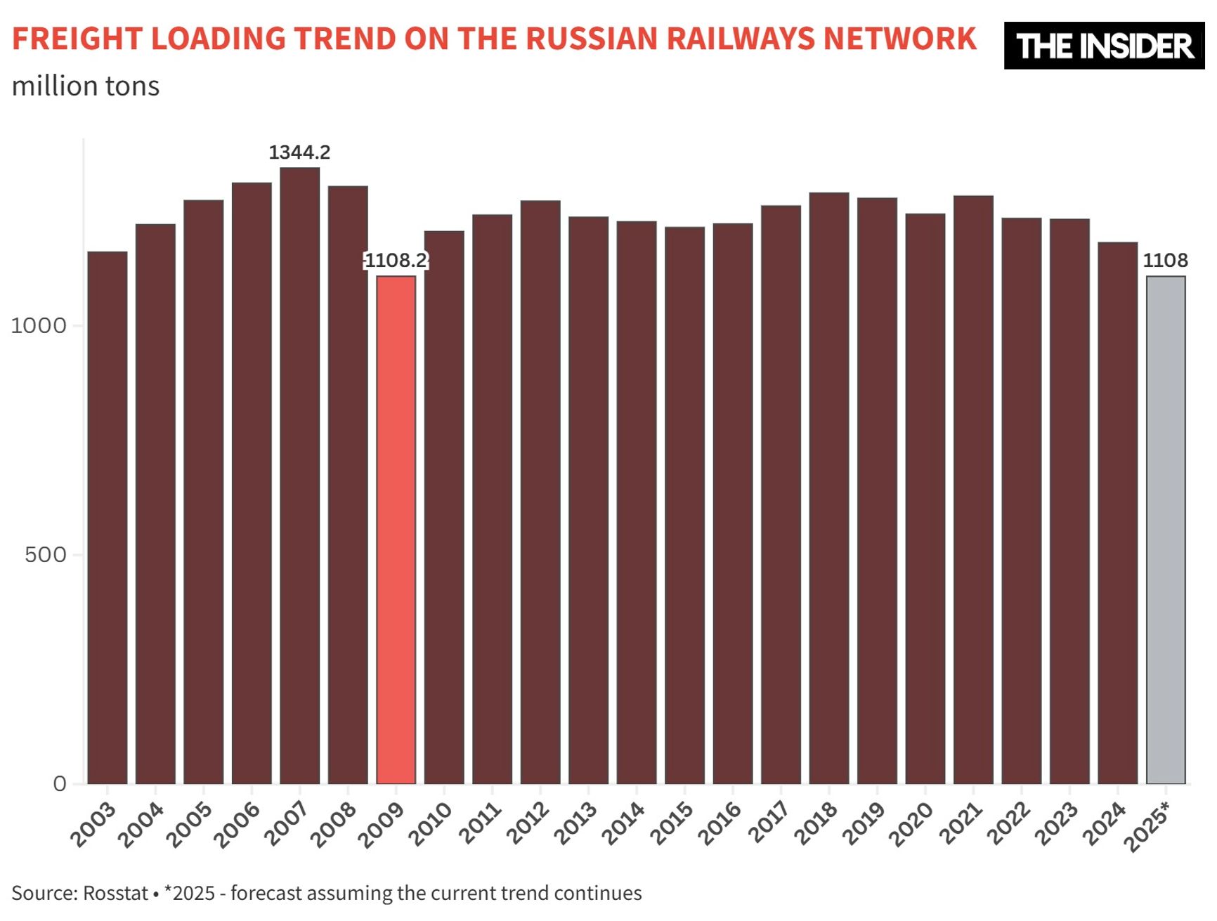 The 2024 calendar year already saw the lowest freight loading numbers in Russia since the financial crisis year of 2009. If, by the end of 2025, volumes fall by a year-on-year total of 6.2 percent or more, the volume of cargo transported by Russian Railways would then be the lowest since 2003.