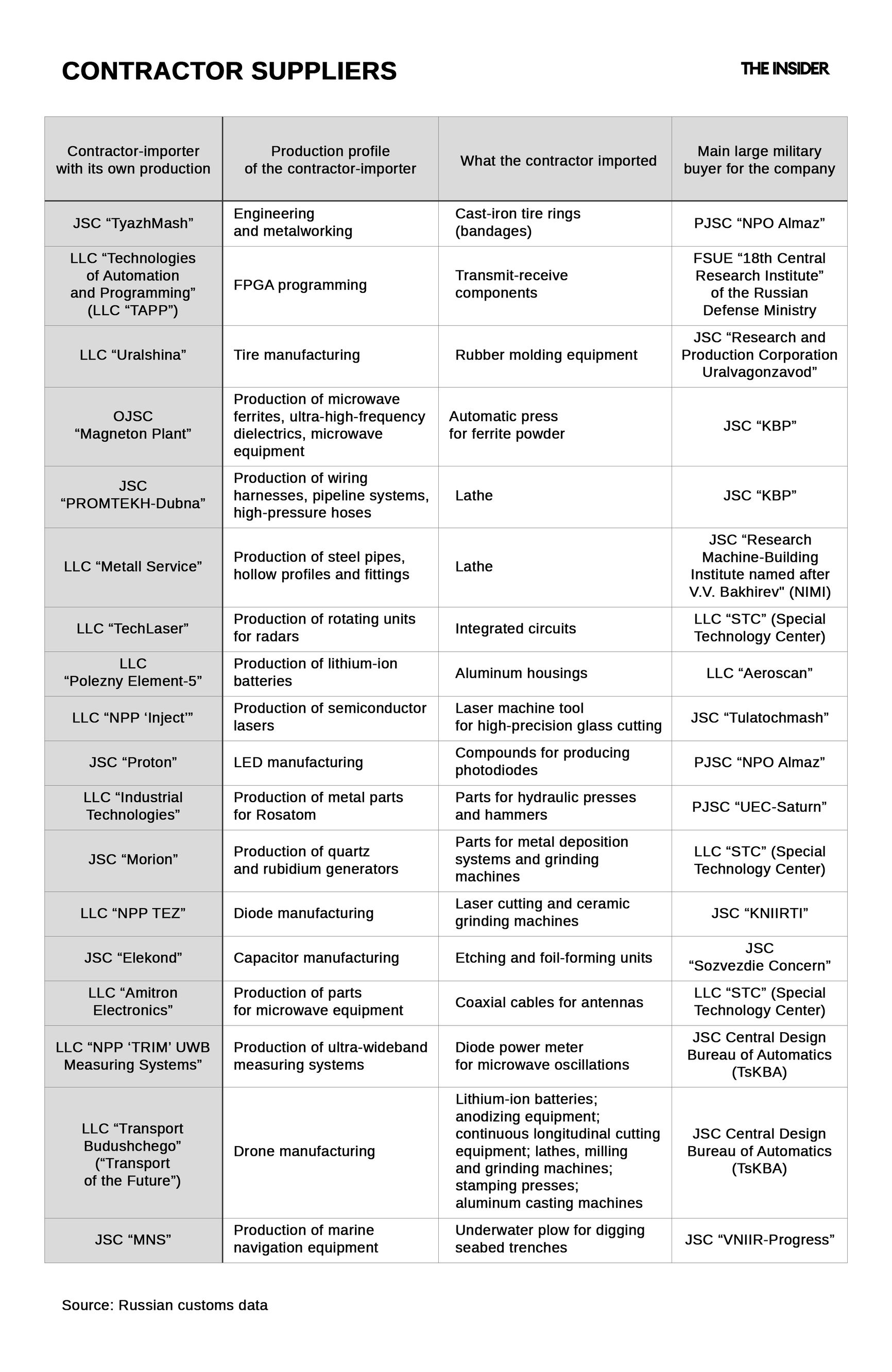 Customs data show that in 2024 about 10,000 Russian companies imported sanctioned products worth more than $22 billion. More than 2,000 of those companies were contractors for leading defense-industry enterprises. According to data obtained by The Insider, those contractors made direct deliveries to major military-industrial firms worth more than 80 billion rubles, or about $1 billion.