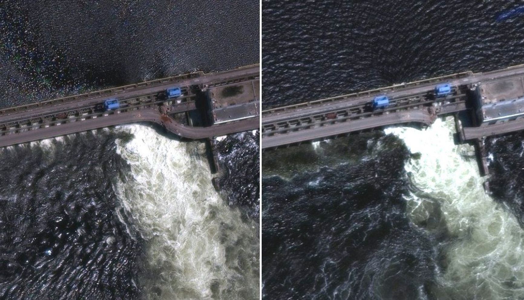Ukrainian media project and Radio Liberty affiliate Skhemy also published satellite images of the Kakhovskaya HPP dam before and after the explosion (dated June 4 and 6).