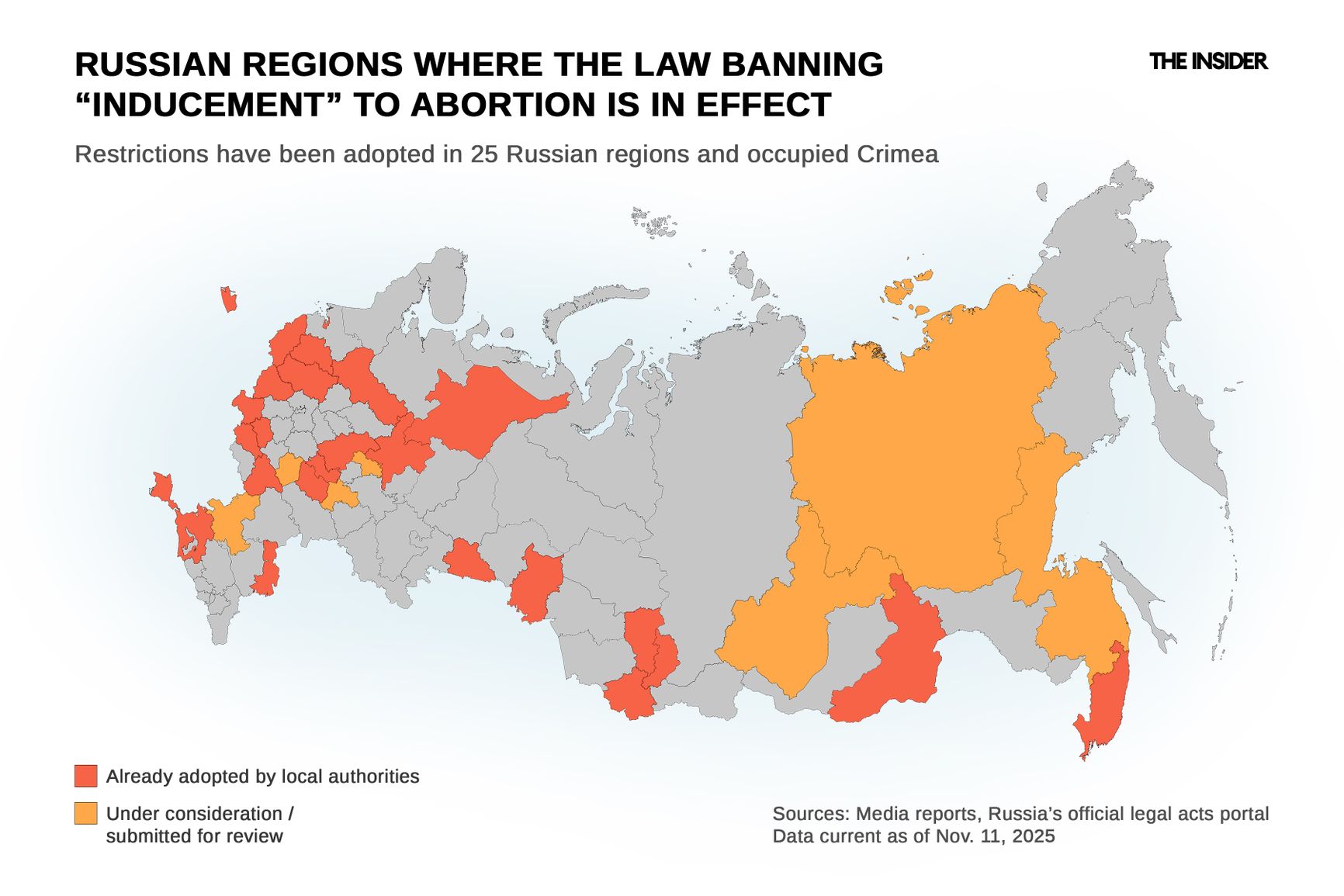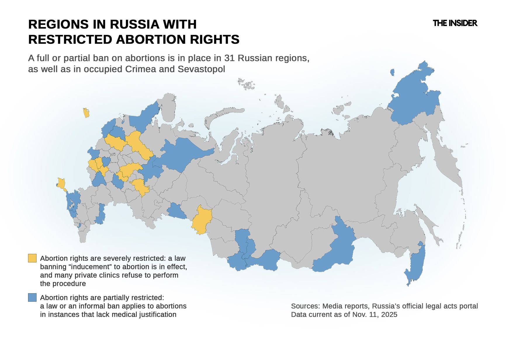 By The Insider’s count, as of November 2025 abortion rights have been fully or partially restricted in at least 31 out of Russia’s 83 federal subjects, as well as in annexed Crimea and Sevastopol.