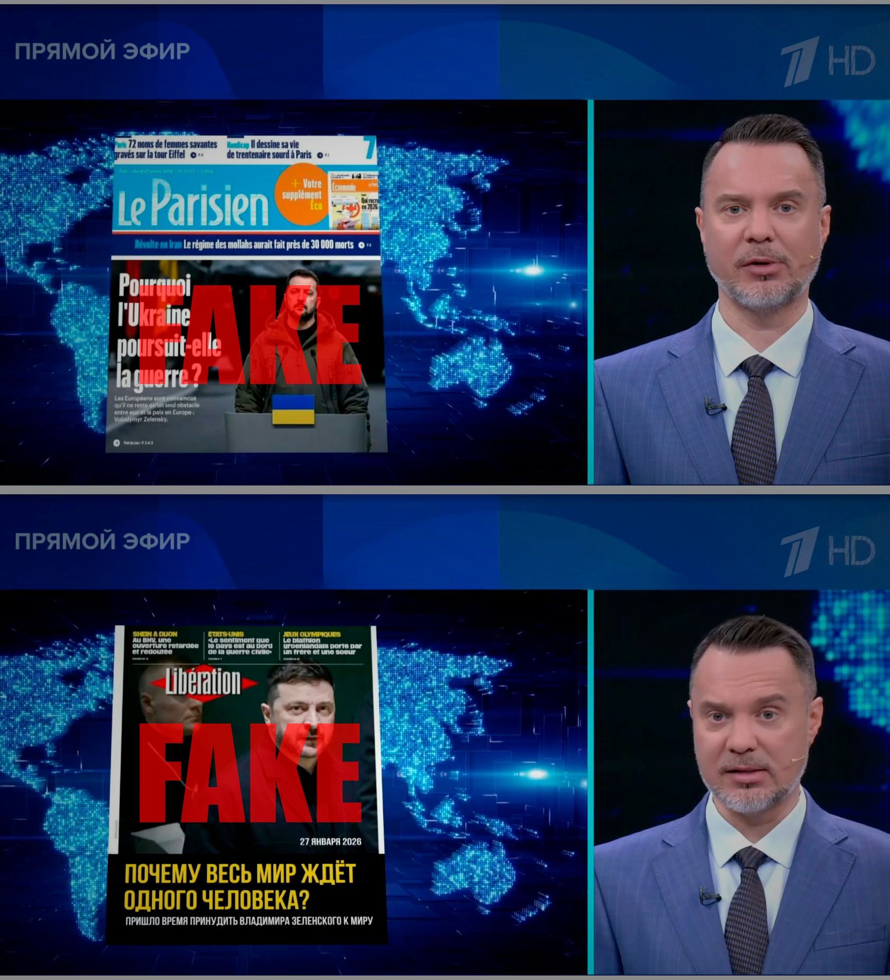 On Jan. 29, the “Vremya Pokazhet” talk show on Russia’s Kremlin-controlled Channel One (Perviy Kanal) presented “proof” of what the program’s host said was criticism directed against Ukrainian President Volodymyr Zelensky by the French press. The covers of two French newspapers — Libération and Le Parisien, both showing the date Jan. 27 — were presented on screen to corroborate his allegations. However, it later emerged that the front pages displayed on Russian television were fabrications created and spread by the “Matryoshka” bot network, according to analysis conducted by the Bot Blocker project.
