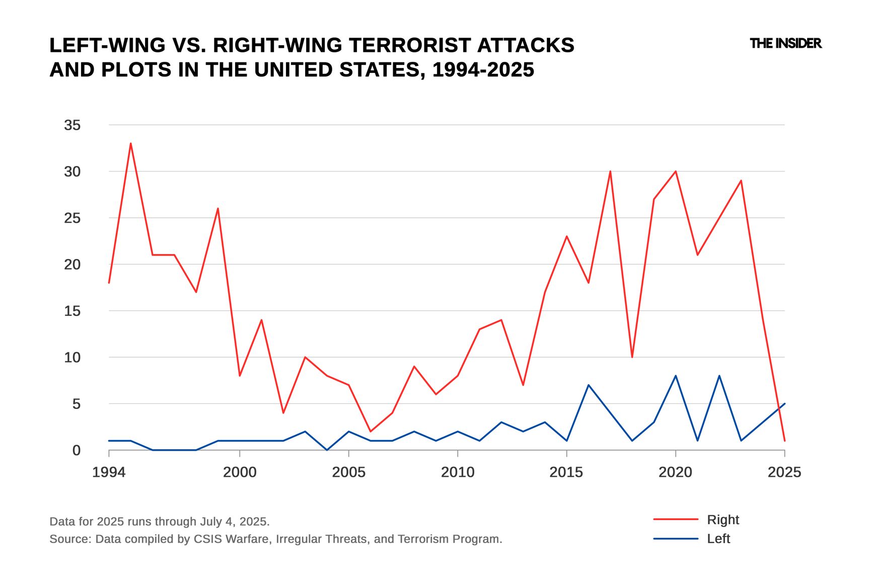 Notably, both right-wing and Islamist terrorist attacks have been on the decline of late. The researchers attribute the decline in jihadist attacks to the weakening of al-Qaeda and ISIS. However, the sharp drop in right-wing terrorism is more surprising and harder to explain. From 1994 to 2000, followers of this ideology perpetrated an average of 21 attacks or planned attacks per year. From 2000 to 2010, the annual average fell to seven, though from 2011 to 2024, it rose back to 20 per year. In the first half of 2025, using the same methodology, the study’s authors recorded only one ultraright terrorist incident in the U.S.: the killing of Democrat Melissa Hortman and her husband.