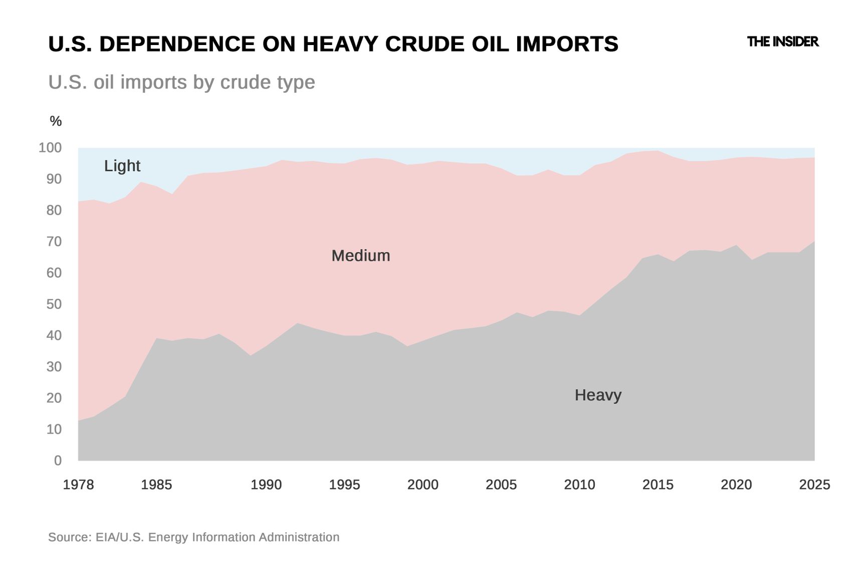 The share of heavy crude imports in the U.S. rose from 19% in 1978 to 70% by 2024, meaning America has an economic interest in diversifying its suppliers, regardless of the regime in power in Venezuela.