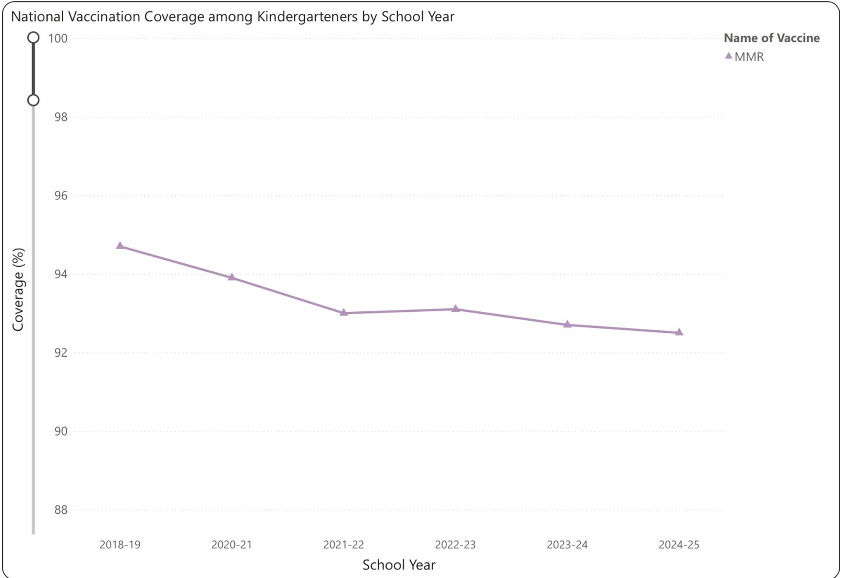 At the top: MMR vaccination coverage (in percent) in the United States from 2018 to 2025. At the bottom: the number of measles cases from 2023 to 2025
