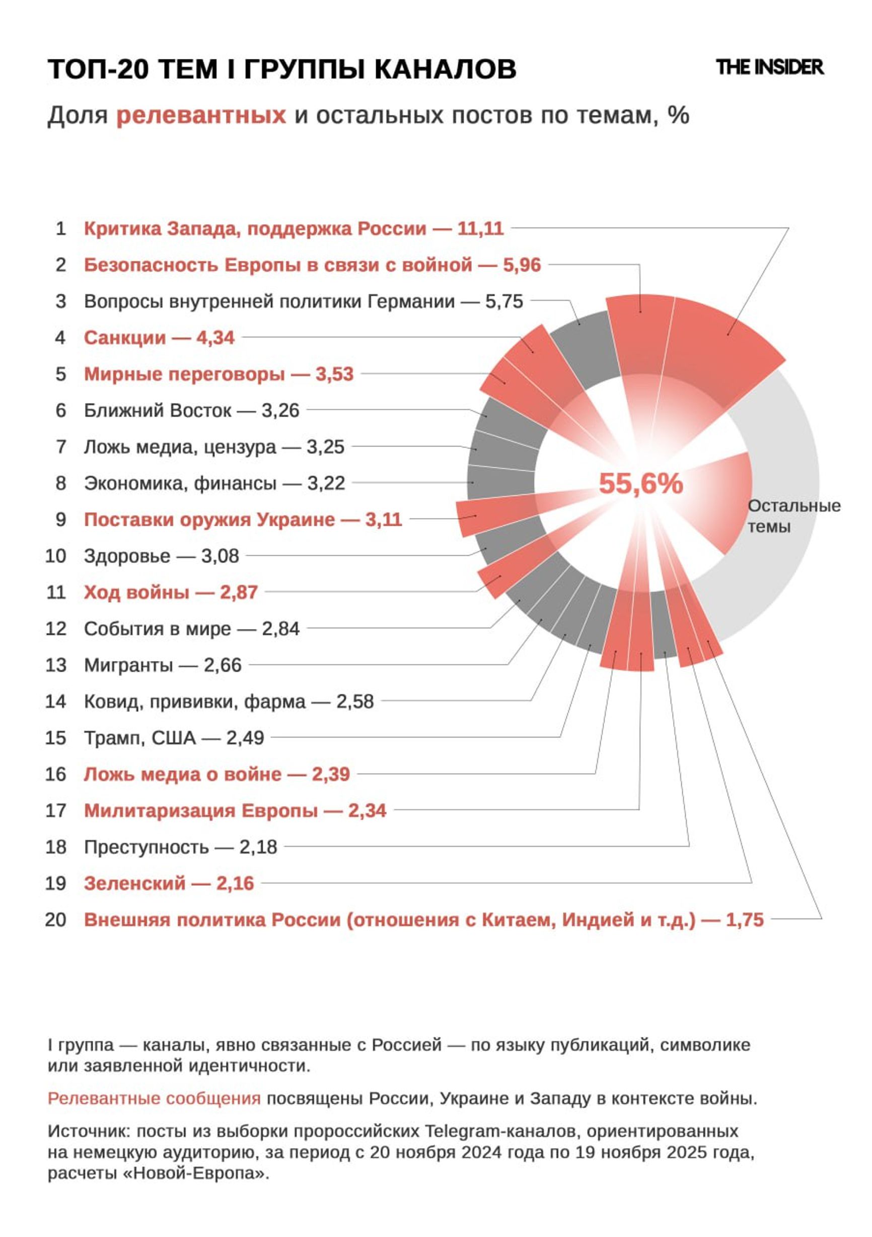Примерно половина всего общественно-политического контента в немецком сегменте Telegram контролируется сеткой RT и продолжает активно распространять прокремлевскую дезинформацию, показывает анaлиз The Insider и «Новой газеты — Европа». Каналы начали накачиваться аудиторией сразу после полномасштабного вторжения и, несмотря на европейские санкции, продолжают активно продвигать фейки. Некоторые из владельцев пабликов этой сетки связаны с центром ГРУ, занимающимся дезинформацией.