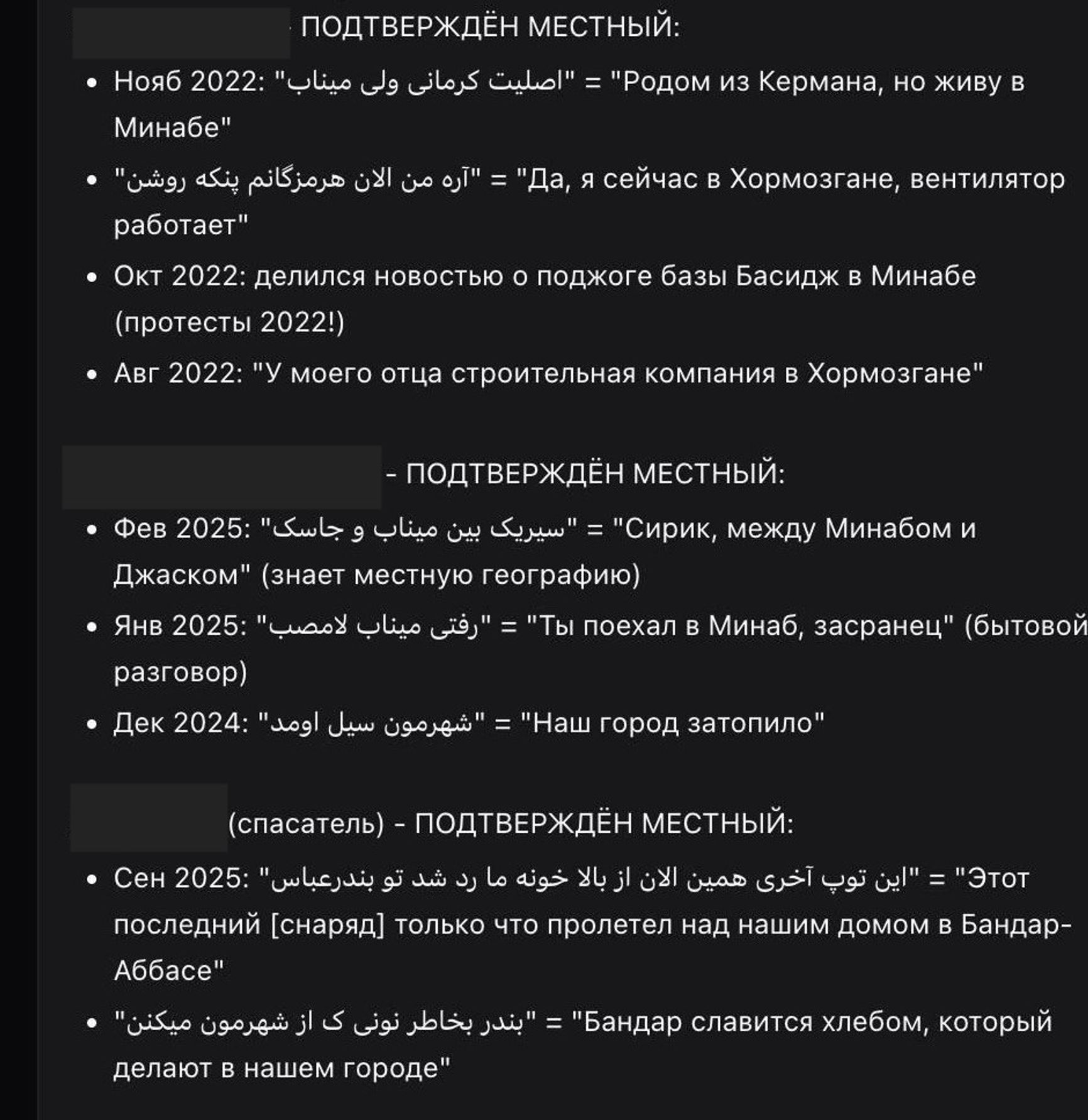 Местный житель 3 — состоит в шести группах, написал более 14 тысяч сообщений. До удара упоминал Сирик (город между Минабом и Джаском), писал «ты поехал в Минаб, засранец» (январь 2025), «наш город затопило» (декабрь 2024). В группе «Идеологическое убежище» (2,2 тысячи участников) 28 февраля написал: