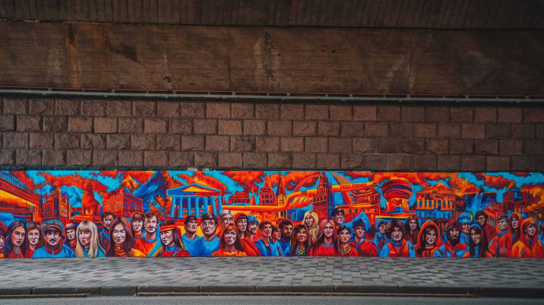 В подписи утверждается, что 20-метровая картина посвящена Дню народного единства и воплощает в себе «сплоченность народов, мощь достопримечательностей и достижений России». Помимо прочего, анонимные авторы изобразили газопровод «Сила Сибири».