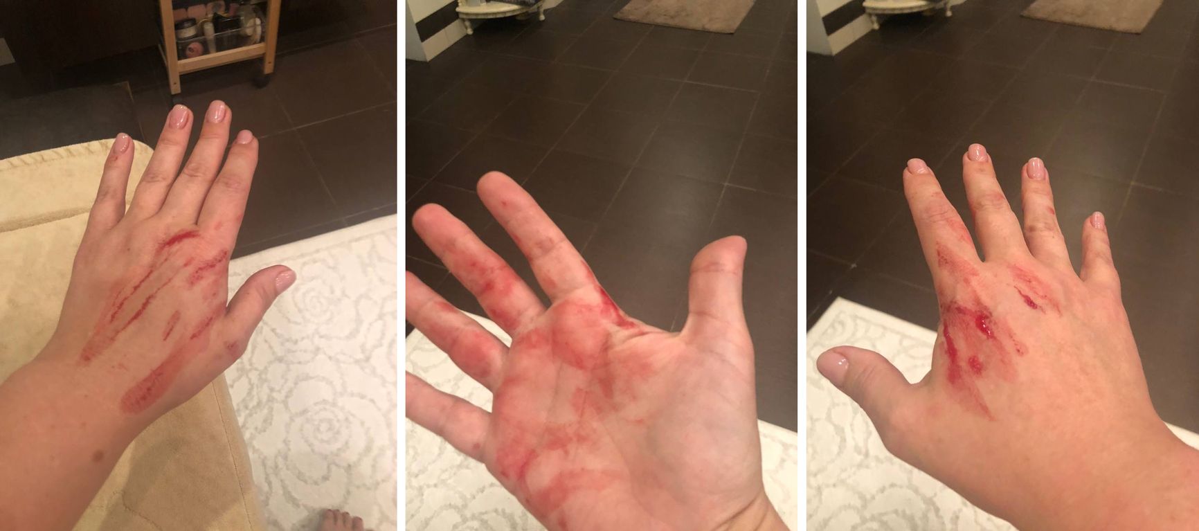 Хорошо помню одно, как меня за шкирку волохают по полу, орут что-то и придавливают лицом к металлическому борту кровати. А я, согнувшись, закрывала обеими руками живот, потому что боялась, что ударюсь им, амортизировать было нечем, поэтому потом синими полностью были все плечи, которые приняли на себя удары о каркас. Я долго еще носила футболки с рукавами до локтя.