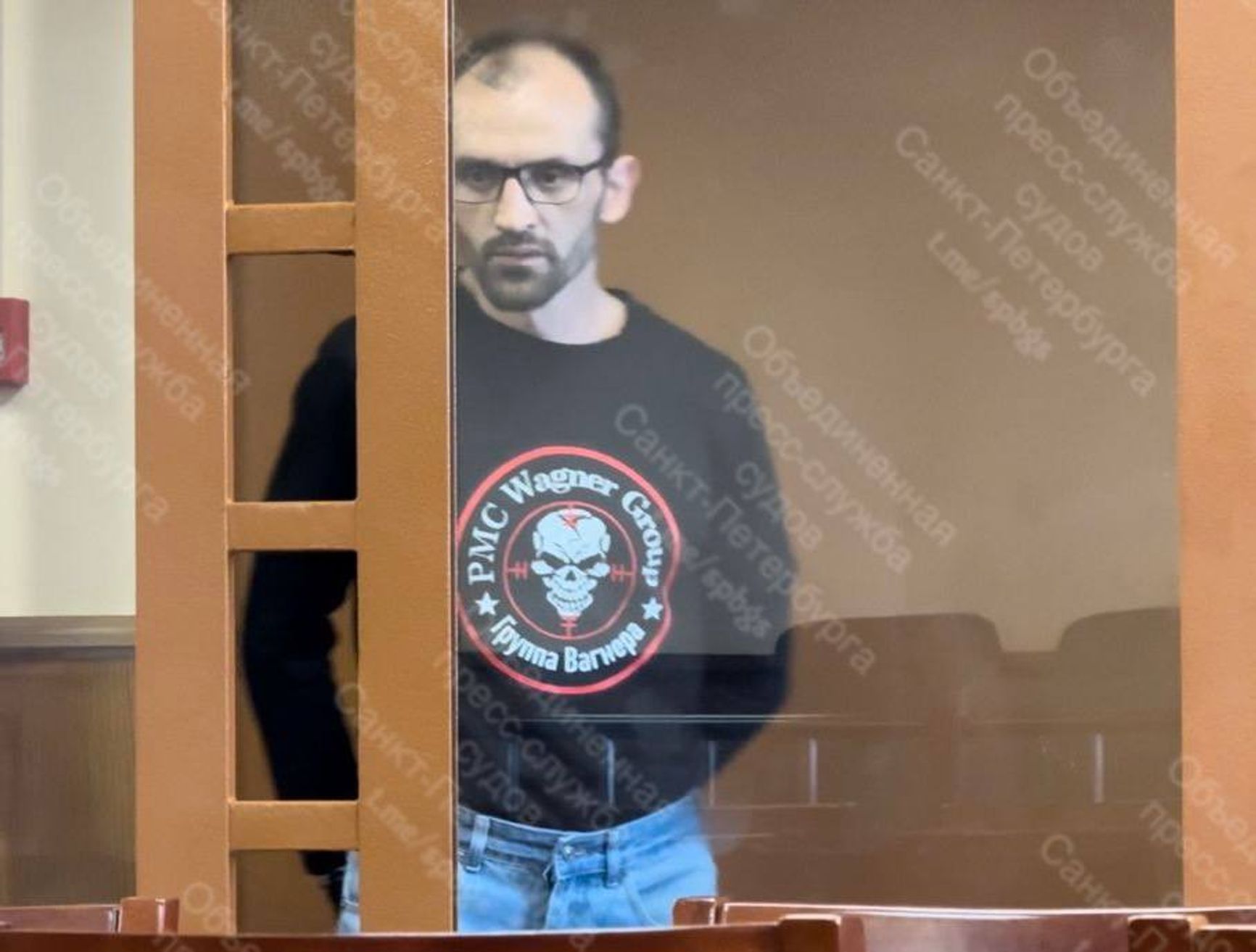 На оглашение приговора подсудимый пршел в черном худи с символикой ЧВК Вагнера.