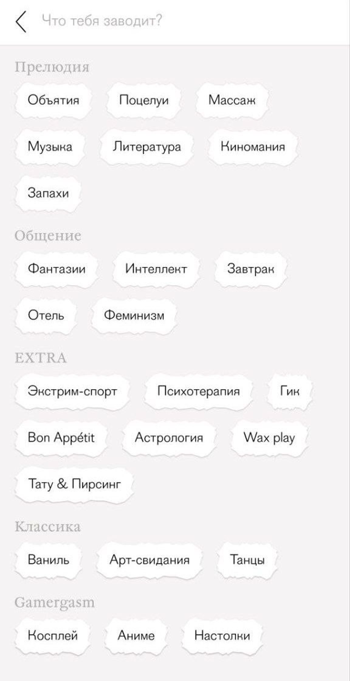 По словам самих пользователей приложения, в разделе «Соблазны» для российских пользователей теперь доступны только «невинные» пункты, такие как объятия, поцелуи, массаж, музыка и литература. При этом пользователи из других стран могут указать, что им нравятся оральный секс, домашнее порно или когда за их сексуальными практиками кто-то наблюдает.