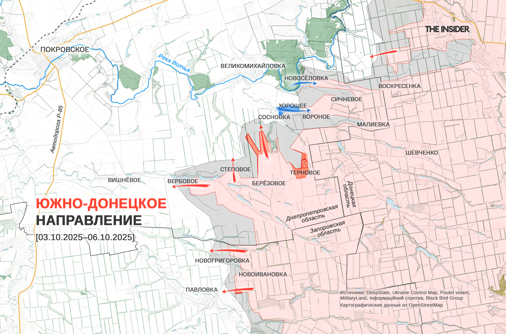 Анатолий Радов в течение нескольких дней сообщал (1, 2, 3, 4) о продвижении ВС РФ в южной части Покровска (до 2016 года — Красноармейск). Согласно его карте на 6 октября, российским военным удалось практически полностью выдавить СОУ из городской застройки южнее трассы Е50. В районе Добропольского выступа, по сведениям Радова, ВС РФ вернули контроль над Заповедным (до 2024 года — Никаноровка) и Панковкой, а также продвинулись в сторону Шахова (до 2016 года — Октябрьское), тогда как СОУ контратаковали в Дорожном. «Военкор» Котенок также писал об успешных контратаках ВС РФ в районе Добропольского выступа и перехвате инициативы на этом участке. Он также сообщал (1, 2) о продвижении ВС РФ в южной части Покровска, а также к северо-востоку от Мирнограда (до 2016 года — Димитров) и в Родинском на трассе Покровск — Доброполье.