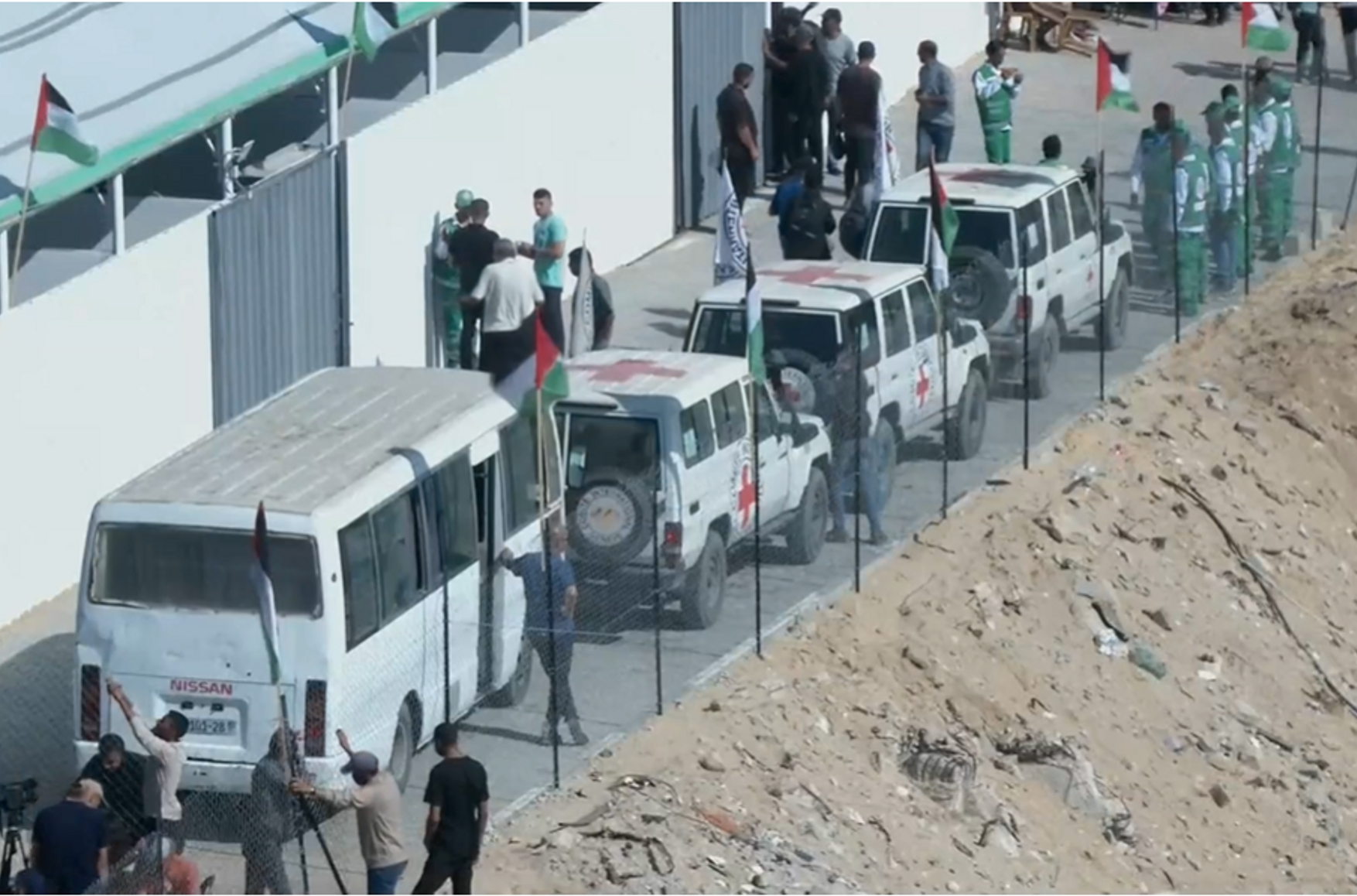 Фото: машины Красного Креста в ожидании передачи заложников / трансляция Reuters