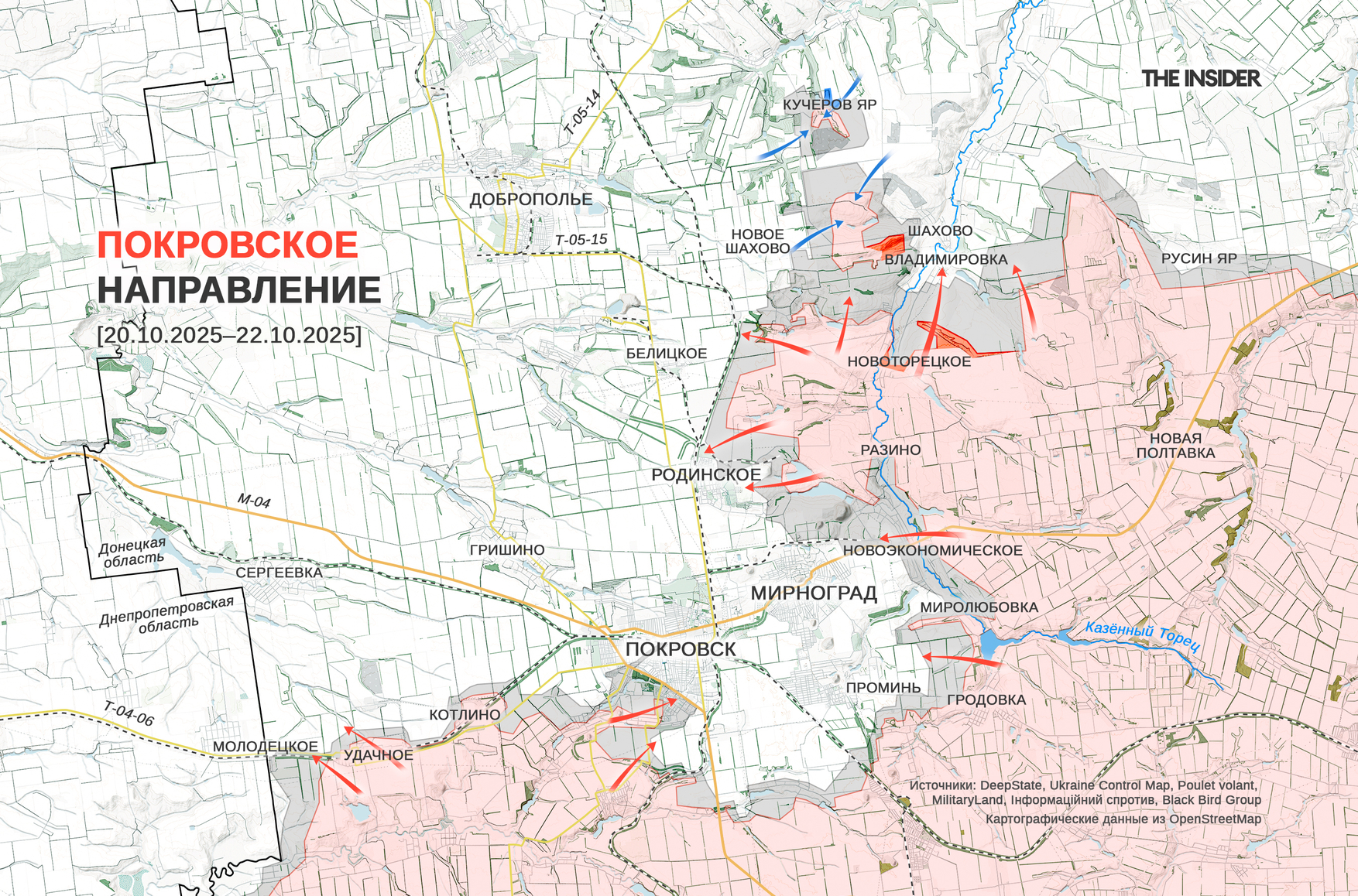 «Военкор» Юрий Котенок признает, что, несмотря на продвижение, украинские позиции сохраняются в южных районах Покровска, и характеризует обстановку в городе как «слоеный пирог». По его оценке, ВС РФ продвигаются на западном охвате агломерации на Сергеевку, а также практически зачистили Проминь — последний населенный пункт к востоку от Мирнограда. По версии «военкора», российским военным также удалось занять Шахово.