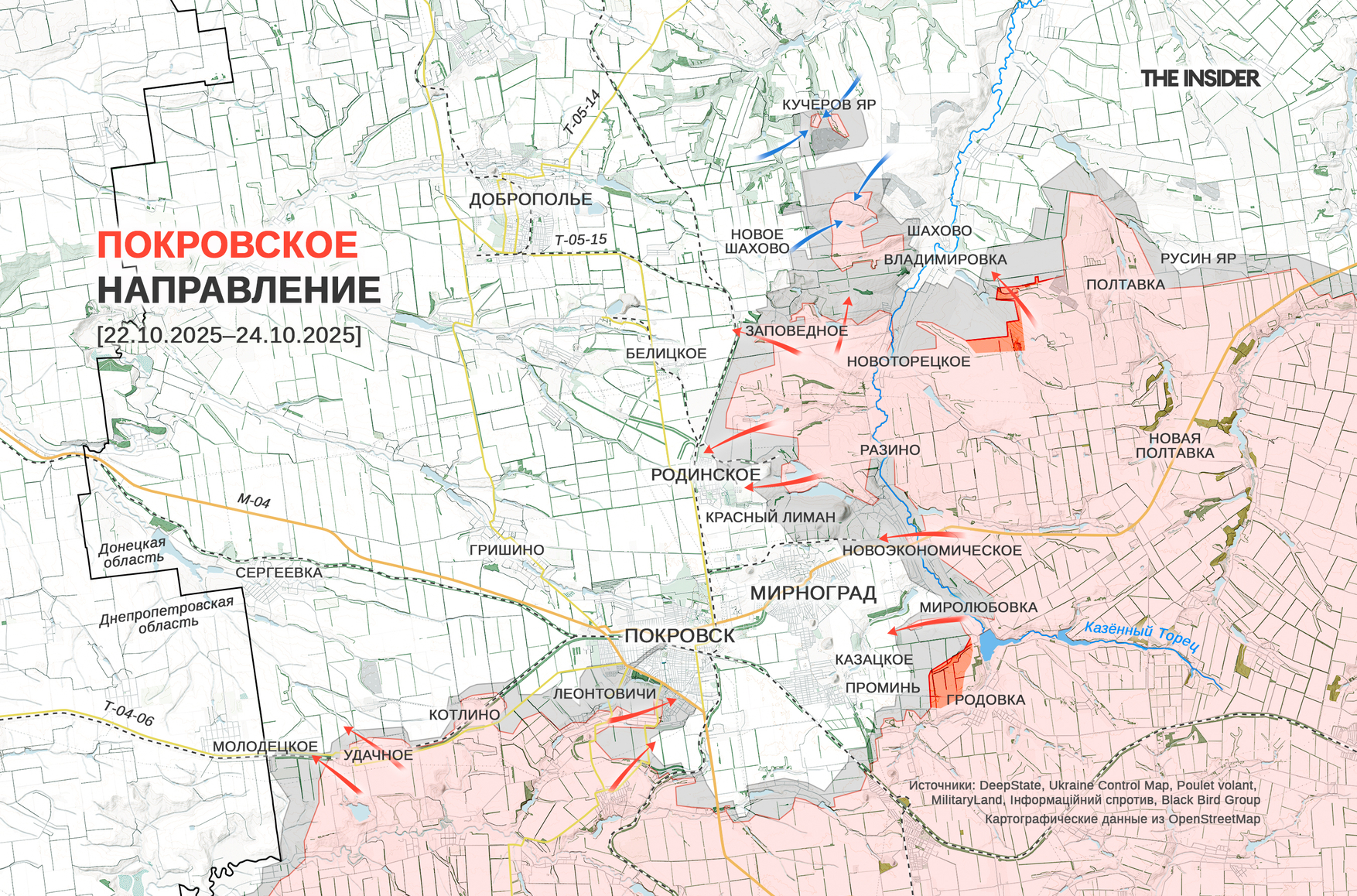 DeepState пишет, что СОУ отбросили ВС РФ от Кучерова Яра в Добропольском выступе, а российские войска продвинулись в районе Владимировки у основания выступа и Гродовки к юго-востоку от Мирнограда, где недавно имели место российские механизированные штурмы. Минобороны РФ, в свою очередь, отчиталось о захвате села Проминь к востоку от Мирнограда. Тем временем российский военблогер Анатолий Радов сообщает о продвижении ВС РФ в северной части села Шахово (до 2016 года — Октябрьское), также расположенного в основании выступа. Он также утверждает, что российские войска почти сомкнули «клещи» за группировкой СОУ, находящейся в полях под Мирноградом, между Казацким (до 2024 года — Московское) и Проминью, что приведет к образованию «котла».