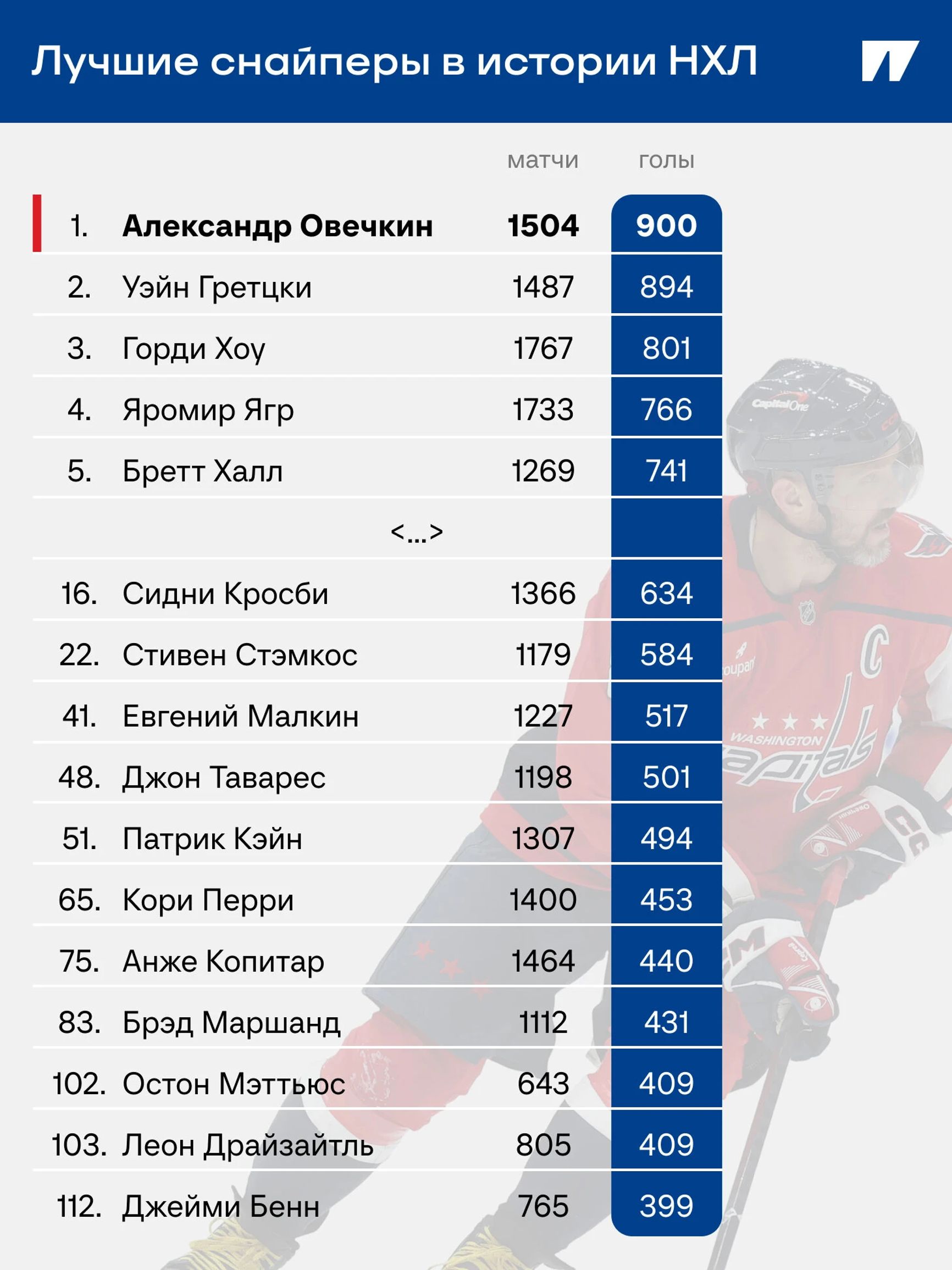 Овечкин забросил 900 шайб в 1504 матчах. Прежний рекорд принадлежал Уэйну Грецки — 894 шайбы (1487 матчей). Этот рекорд Овечкин побил в апреле, забросив 895-ю шайбу.