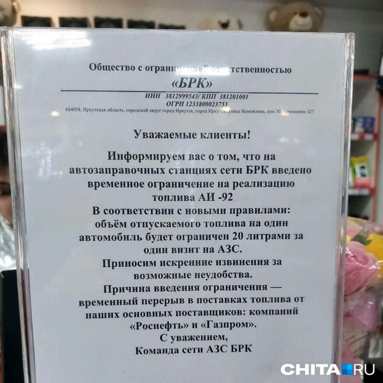 21 октября сеть АЗС БРК в Забайкалье ввела ограничение на продажу бензина АИ-92 — не более 20 литров на автомобиль, объяснив это задержками отгрузок со стороны НПЗ. Аналогичные ограничения действовали в Иркутской области. В компании уточнили, что перебои с топливом затронули и другие сети. В тот же день жители Читы сообщили, что на заправках «Корс» также продают по 20 литров в руки, а на некоторых АЗС «Роснефти» и в соседней Бурятии бензин полностью закончился. Спустя несколько дней на АЗС «Корс» и БРК появились официальные объявления об ограничениях.