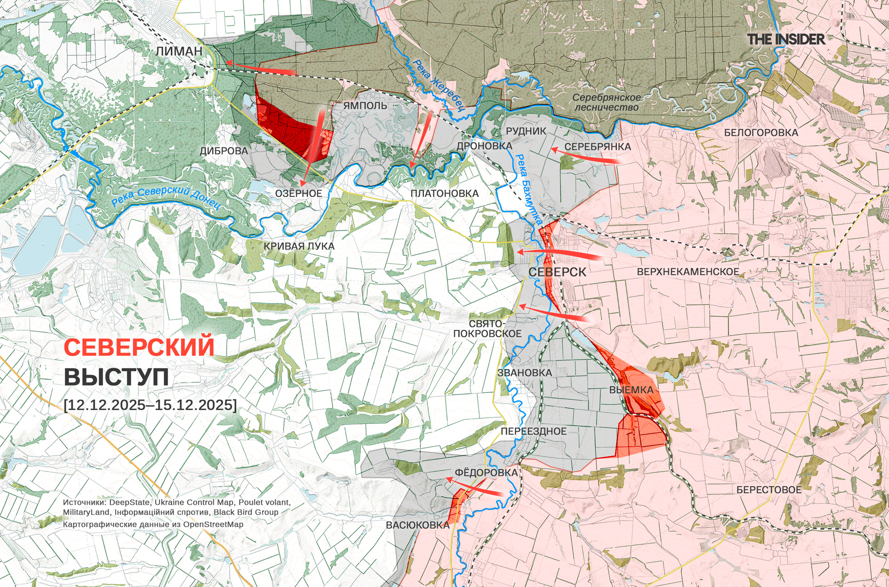 DeepState сообщает, что ВС РФ продвинулись в районе Выемки и в Северске. Украинский OSINT-ресурс In Factum нанес на карту точки фиксации российских военных в городе и за его пределами и сделал вывод о потере Северска. В то же время Playfra всё еще относит значительную часть города к «серой зоне», отмечая, что украинские дроноводы отошли на высоты к западу от Северска и пытаются не дать противнику закрепиться в городской застройке. По сведениям Z-каналов (1, 2), ВС РФ не только полностью заняли Северск, но и продвигаются к западу от него.