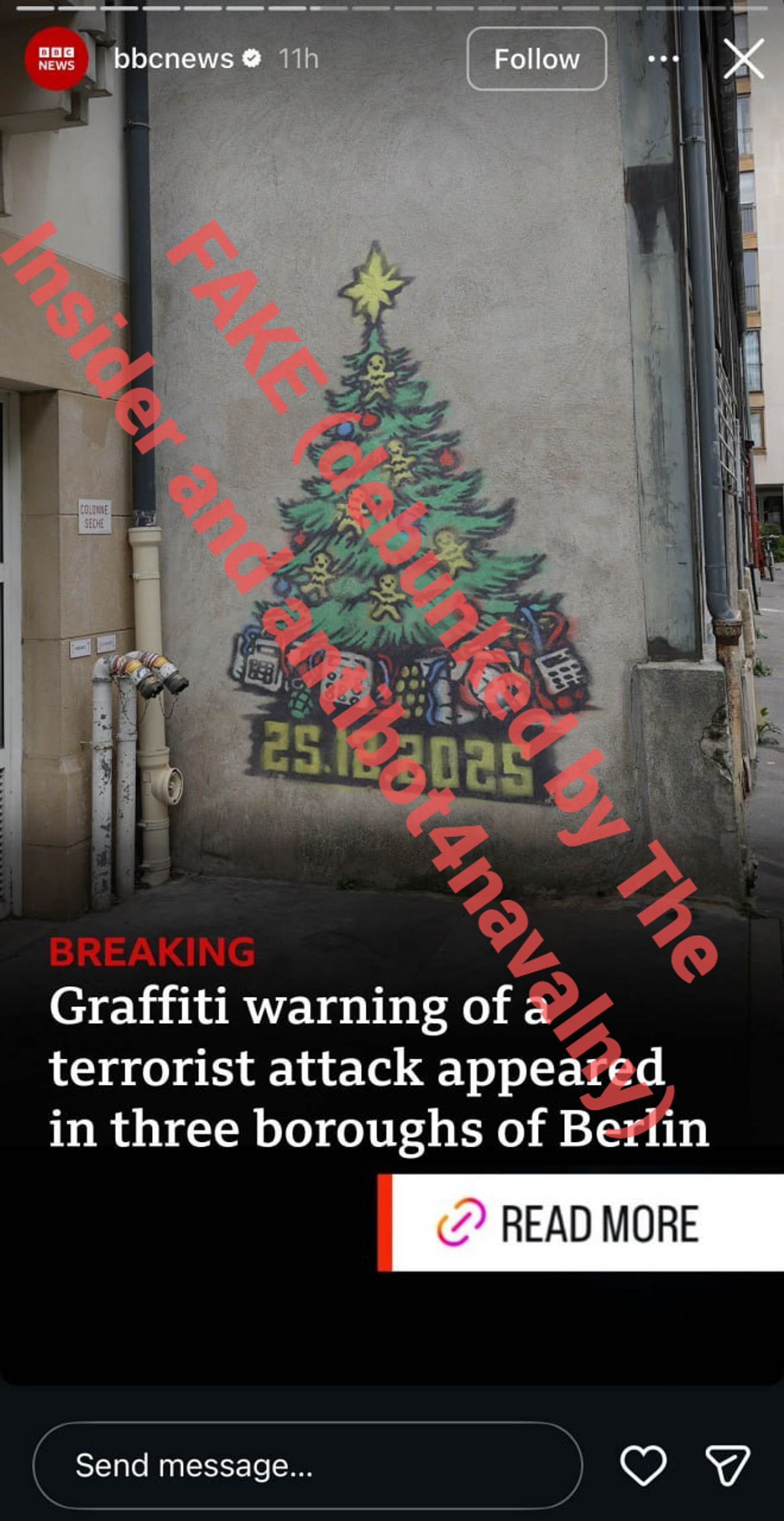 Кроме того, боты распространяют картинки с пугающими граффити, якобы появившимися в Берлине, — на них изображена рождественская елка с часовой бомбой под ней.