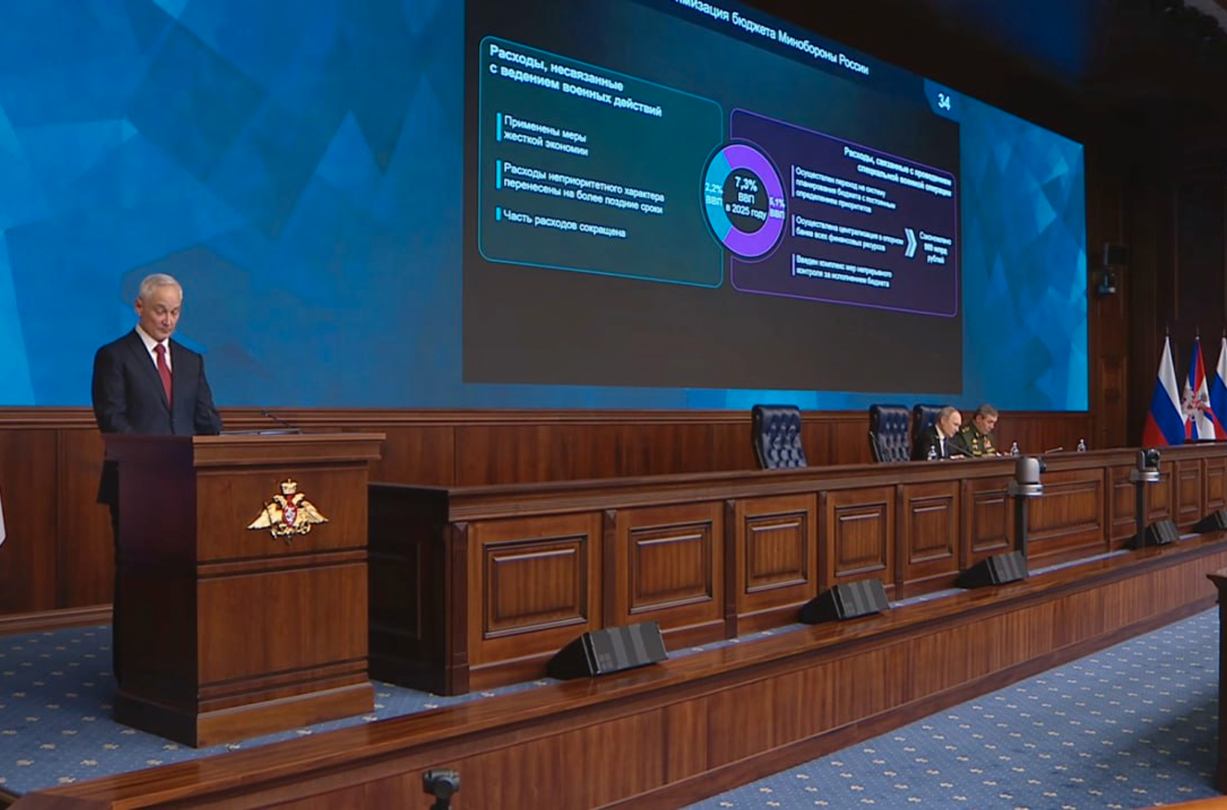 Белоусов заявил, что Минобороны в 2025 году работает в условиях строгих финансовых ограничений со стороны федерального бюджета. Общий бюджет министерства он оценил в 7,3% ВВП, что составляет около 15 трлн рублей. При этом долю расходов, не связанных с боевыми действиями, в 2025 году удалось сократить с 2,7% до 2,2% ВВП. Ранее власти не раскрывали общий бюджет Минобороны, включая его закрытую часть, ссылаясь на соображения секретности.