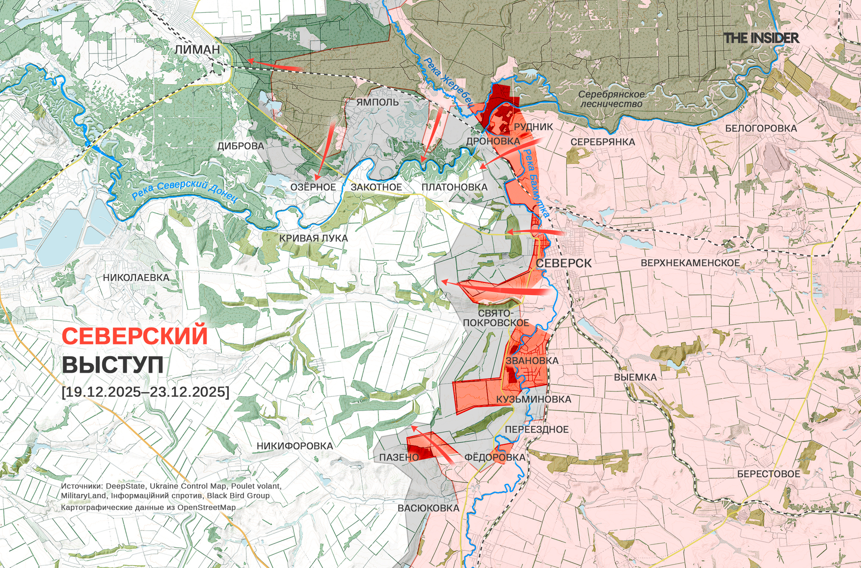 В DeepState сообщили о расширении зоны контроля ВС РФ в районе Свято-Покровского (до 2016 года — Кирово) к югу от Северска. Само село проект относит к «серой зоне». «Военкор» Юрий Котенок сообщает о боях за Свято-Покровское и за высоты к западу от Северска.