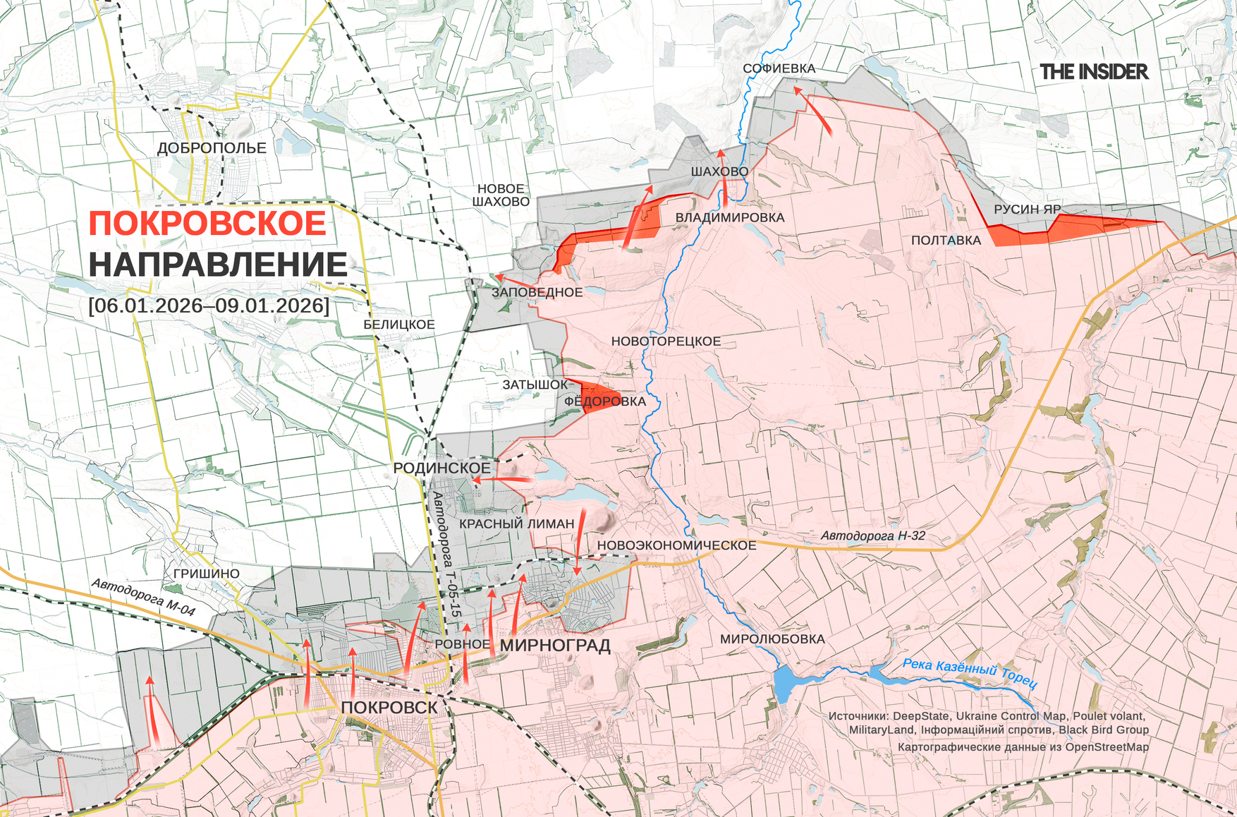 Исследователь под ником Playfra описывает наступление российских войск в Покровске (до 2016 года — Красноармейск) и Мирнограде (до 2016 года — Димитров). На западе Покровска российские бойцы штурмуют промзону и железную дорогу и продвигаются далее на север в районе Гришина «с неизвестными результатами». Также ВС РФ пытаются наступать со стороны шахты «Краснолиманская» в направлении центра Красного Лимана, отдельные группы под прикрытием застройки проникают в соседний город Родинское. Проект In Factum отмечает, что присутствие российских военных фиксируется в северо-западных окрестностях Мирнограда, что может означать окончательный отход ВСУ из него. Вероятнее всего, украинские подразделения отошли за железную дорогу, проходящую западнее Мирнограда и «разрезающую» пополам Покровск. Благодаря этому они всё еще удерживают северную часть Покровска (1, 2).