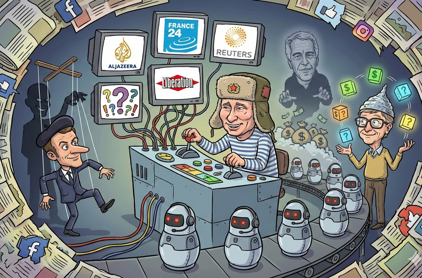 Дезинформация также распространяется через сфабрикованные обложки французских изданий. На поддельной обложке La Croix (реальная обложка номера) утверждается, что Елисейский дворец отказался комментировать визиты Макрона на остров Эпштейна. Фальшивые обложки Le Parisien (реальная обложка номера) и Libération (реальная обложка номера) от 2 февраля 2026 года утверждают, что Макрон 18 раз за 18 месяцев посещал остров Эпштейна в период работы министром экономики.