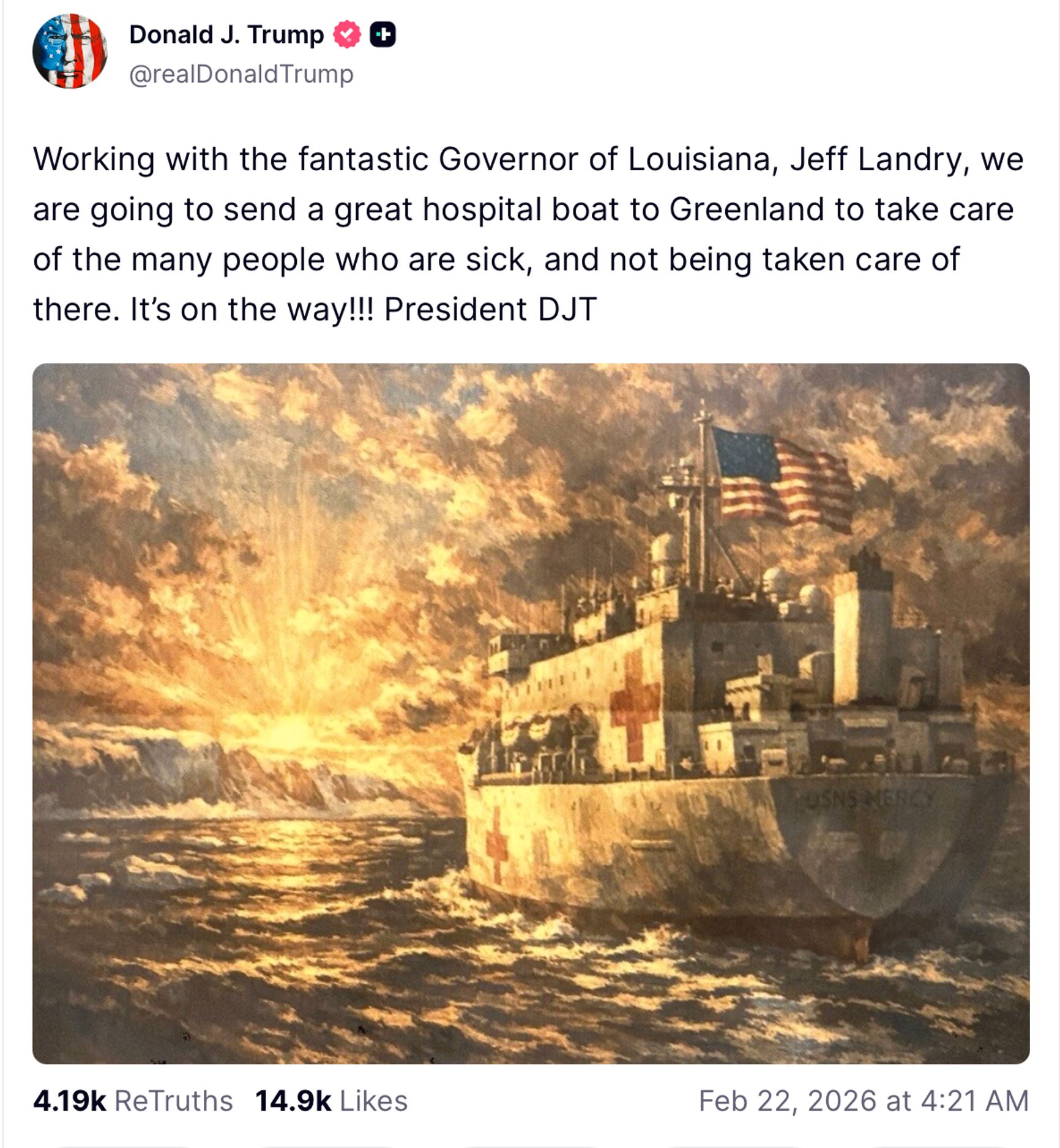 «Вместе с фантастическим губернатором Луизианы Джеффом Лэндри мы собираемся отправить в Гренландию большое судно-госпиталь, чтобы позаботиться о многих больных, которым там не оказывается необходимая помощь. Оно уже в пути!!!»
