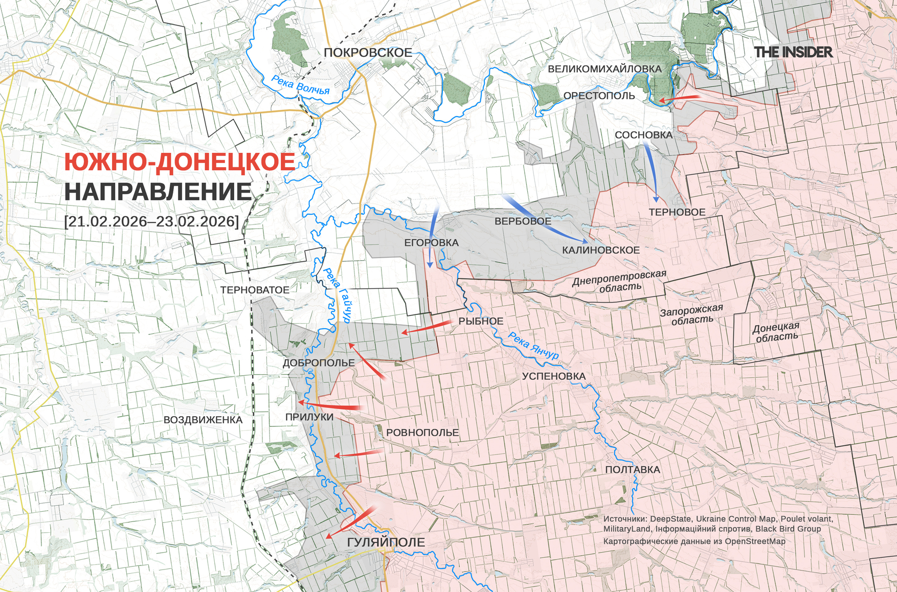 По оценке OSINT-сообщества Black Bird Group на 21 февраля, площадь территории, над которой утратили контроль российские войска, составляла 150 км², но по большей части она превратилась в «серую зону», а не перешла под контроль СОУ. Уже на следующий день в ДШВ отчитались об освобождении 300 км² и заявили, что перед группировкой украинских десантников стоит задача разгромить противника и вытеснить его из Днепропетровской области. По словам главнокомандующего ВСУ Александра Сырского, с конца января на этом участке «восстановлен контроль» над 400 км² и восемью населенными пунктами.