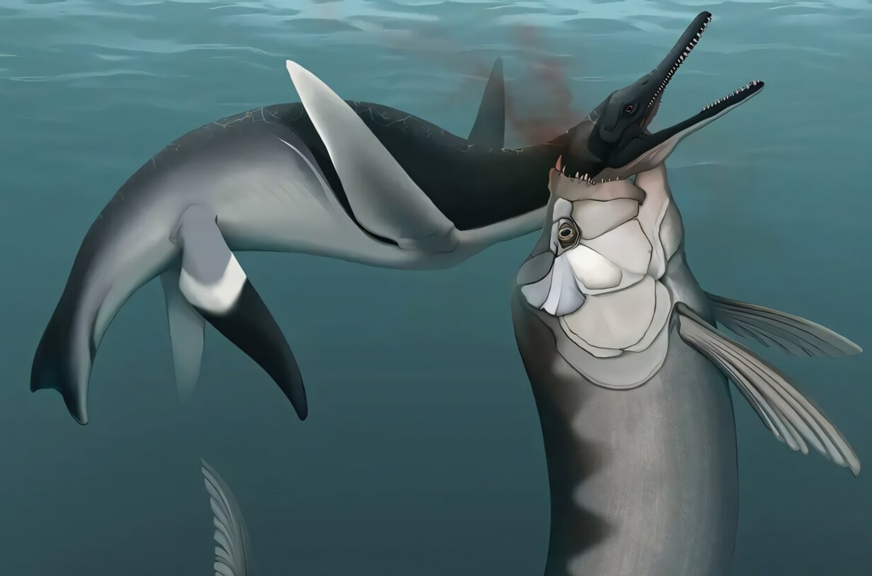 Удар пришелся точно в горло: зуб вошел снизу в шейный позвонок и пробил его насквозь. Такая рана почти наверняка оказалась смертельной — она повредила бы сонную артерию и трахею, лишив рептилию воздуха и нарушив плавучесть. Тело быстро опустилось на анаэробное дно, где почти без доступа кислорода сохранилось в относительной целости — именно поэтому скелет дошел до наших дней практически полным.